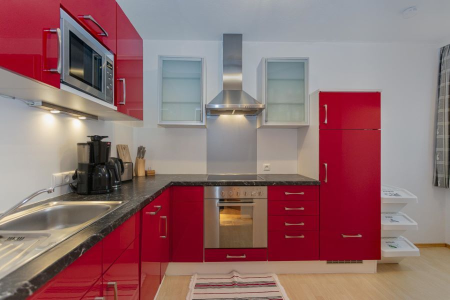 - Voll ausgestattete Küche mit 4-Platten Cerankochfeld inkl. Backrohr, Geschirrspüler, Wasserkocher, Kühlschrank mit Gefrierfach, Toaster, Wasserkocher und Mikrowelle