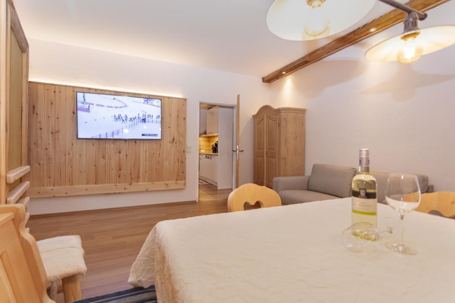 In der Ferienwohnung Hinterhorn wurde hochwertiges Zirbenholz verarbeitet, um ein Ambiente für Ruhe und Entspannung zu schaffen. Auch die beheizbaren Lehmwände und eine kontrollierte Raumbelüftung sorgen für zusätzlichen Komfort.